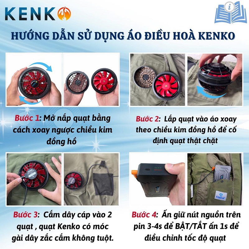 Chú ý: Khi mặc áo điều hòa Kenko cần kéo khóa áo đầy đủ để giữ luồng gió luân chuyển khắp cơ thể, đảm bảo hiệu suất tối ưu của sản phẩm.