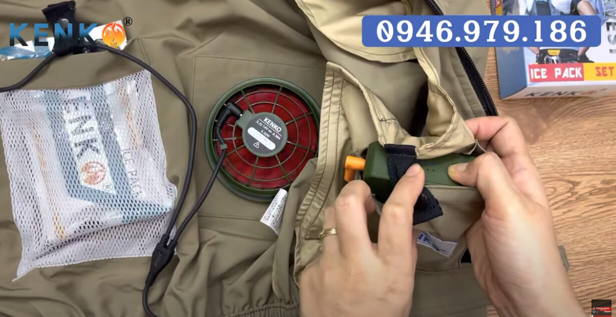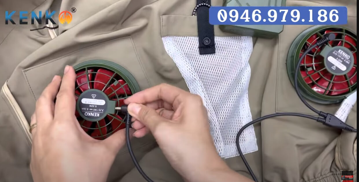Sau khi đã lắp 1 đầu dây nối vào quạt, bạn tiếp tục lắp đầu dây còn lại vào pin áo điều hòa. Ở bên trong áo điều hòa thường có thiết kế túi riêng để đựng pin, bởi vậy, bạn nên cho pin vào túi. Đồng thời ở phần lưng áo cũng sẽ có phần cúc để cố định lại dây nối giữa quạt áo và pin áo.
